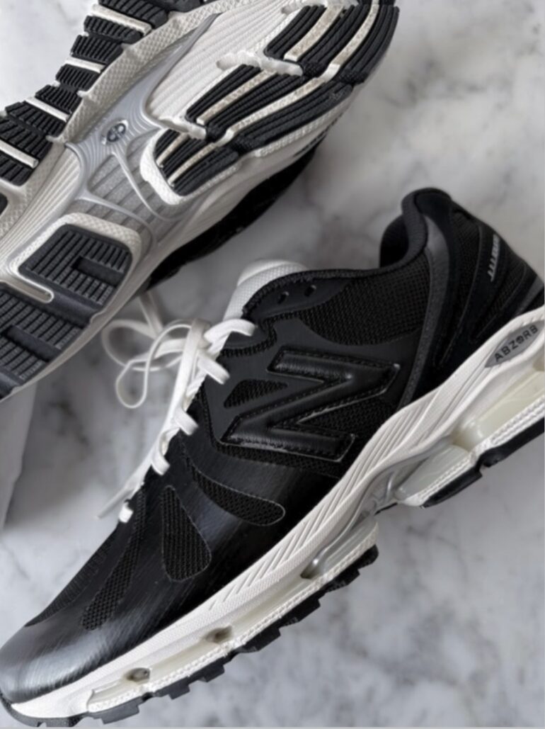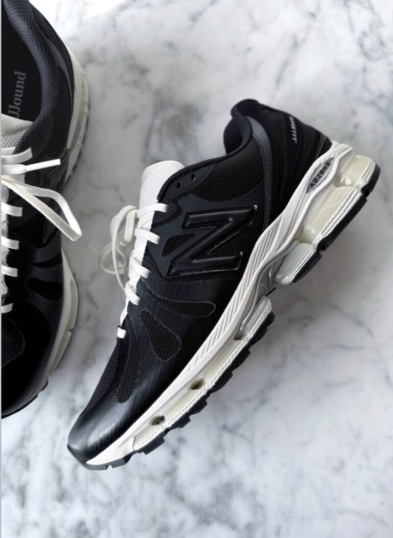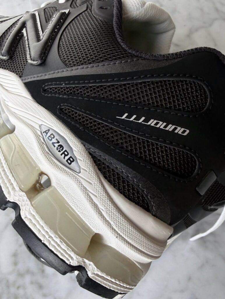 Après les passages de Joe Freshgoods ou Action Bronson, JJJJound apporte sa touche signature. Côté look, un upper quasi intégral en mesh noir avec des empiècements fusionnés dans le même ton sombre. La languette et lacets blancs qui tranchent, la midsole off-white légèrement patinée et les pods ABZORB crème parsemés d’accents argentés discrets sur le branding. Au talon, le “JJJJound” remplace le logo classique pour une signature subtile.