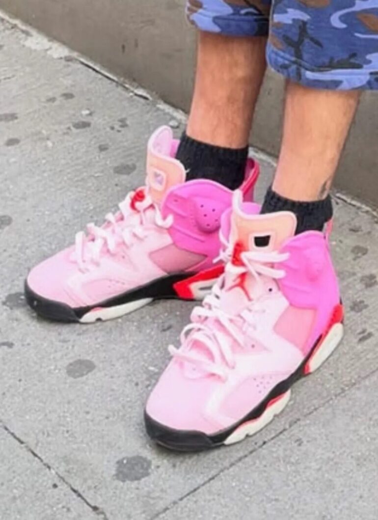 Côté look, l’empeigne mélange plusieurs nuances : un rose pâle sur l’avant du pied, des overlays encore plus clairs, un rose highlighter bien flashy sur le talon et le upper, et une teinte intermédiaire au milieu du pied qui accueille le logo « A » signature d’Awake. Des touches Infrared 23 rappellent l’héritage de la Jordan 6 originale, avec une midsole noire et rouge qui garde l’esprit classique.